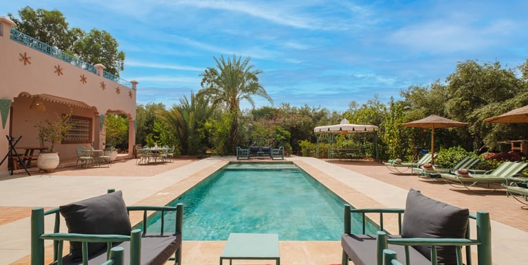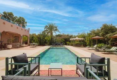 Découvrez votre oasis privée avec piscine et spa à Marrakech, une villa de charme nichée au cœur de la nature, idéale pour un séjour exclusif alliant luxe, sérénité et intimité. Offrez-vous une parenthèse hors du temps dans un cadre raffiné, avec piscine privée, espace bien-être, spa et prestations sur mesure. Parfaite pour des vacances de luxe, un séjour romantique, une retraite bien-être ou une privatisation entre amis, cette propriété d’exception vous promet une expérience unique où confort absolu et art de vivre marocain se rencontrent.